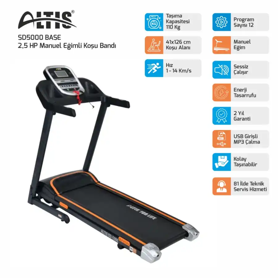 SD5000 BASE: Aksesuarsız, 14 km/s hız, 110 kg kapasite. (Daha çok "Koşu" odaklı).